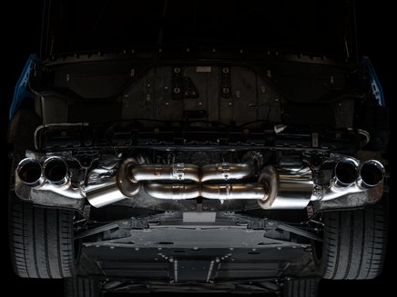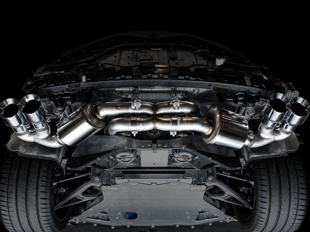 Presenting the Best Sounding Exhausts on the Planet™ for the C8 Corvette: At the intersection of sophistication and aggression lies the Touring Edition Exhaust. A dual 3†T304L stainless steel cat-back configuration, the AWE Touring Edition Exhaust is the perfect dose of steel for drivers looking for straight-pipe performance without sacrificing perfect daily drivability: a deep, sophisticated, exotic exhaust note with zero drone at highway speeds -- and V4 mode! Thanks to the asymmetric design, the number of necessary bends is minimized, thus removing the unwanted restriction in flow while facilitating impressive gains across the entire powerband. Paired with robust internally lined stainless steel flex sections upstream, engine movement is significantly isolated, enabling life-long durability for peace of mind. Going the asymmetric approach also allowed us the opportunity of creating a bespoke cross-over section with entries from both the top and the bottom. Doing this we're able to achieve a rich and aggressive exhaust note out of the LT2 whether it be at idle, rev, or WOT. Beyond the unique crossover, the Touring Edition brings up the rear in proper fashion by featuring AWE’s patented drone-canceling solution, 180 Technology®, which targets and omits drone-prone frequencies while defeating the dreaded in-cabin tone change when switching between V4 and V8 modes. What’s this mean for you? You’ll be tuned into a pure, full-bodied LT2 soundtrack unlike any other without sacrificing in-cabin refinement, all while saving 31 lbs over stock. As a finishing touch, the included aluminum heat shield bolts to the bumper (via factory mounting locations) and resides neatly behind the exhaust, out of sight, with only an AWE logo showing through the rear mesh to let everyone know what team you're on. Why’d we go with an aluminum solution versus a heat blanket? Heat blankets are susceptible to waterlogging and material breakdown over extended periods of time.
