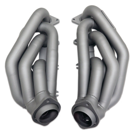 These BBK Performance shorty tuned Length exhaust Headers are designed and constructed as direct fit replacements for all 2005-10 Mustang GT applications. Each header is manufactured with 1-5/8 in. CNC mandrel bent tubing that offers unrestricted exhaust flow for increased horsepower and torque over factory OEM manifolds. BBK tuned Length headers offer improved scavenging waves for better combustion, which leads to improved performance and fuel economy over stock or equal Length headers. As with all BBK Performance exhaust headers they feature a 3/8 in. laser cut flange for additional strength and a guaranteed leak free fit. All headers are robotically and precision hand welded and then pressure tested to ensure years of reliability and performance in the real world. All BBK exhaust headers are available in a high temp titanium ceramic or polished silver ceramic coated finish and include new exhaust header gaskets, header bolts and hardware to complete the installation.