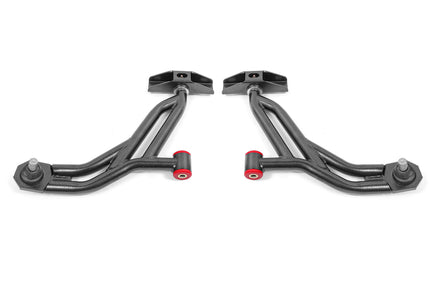 A-arms are one of the most important, yet overlooked suspension components. They are the direct link between the front wheels and the chassis. Any deflection causes a change in alignment, which results in poor performance and driving feel. Fabricated from heavy-duty 1.25-inch, 0.120-inch wall DOM tubing, deflection is eliminated with A-arms from BMR Suspension. BMRs AA755 Lower A-arms are equipped with greasable heavy-duty ball joints, greasable Delrin bushings (rear mount) to handle the high loads, and zinc-plated, X-series, heat-treated, chrome-moly, self-lubricating, Teflon-lined rod ends for loads of adjustability. Solid mounts give you a more responsive feel over the stock rubber bushings. BMRs bushings allow grease to evenly coat the inner sleeve. This efficient lubrication ensures quiet, reliable operation over the life of the bushings. The combination of rod ends and Delrin bushings gives you improved steering feel and responsiveness for any for of driving.BMRs AA755 lower A-arms eliminate A-arm deflection, greatly improving steering feel and response in normal and performance driving situations. The rod ends and Delrin bushings add strength and reduce deflection over the stock rubber bushing. The means you get great performance. Designed for street performance, drag race, and handling, and pro-touring applications, BMR lower A-arms are engineered to give you improved geometry and increased lateral grip during cornering situations.BMR Suspension AA755 Adjustable Lower A-arms are available in black hammertone and red powdercoat for long-lasting good looks. Installation time is 3-4 hours. Proudly made in the U.S.A.Control arm hardware kit RH014 (Includes upper and lower control arm hardware - Highly Recommended) also available.