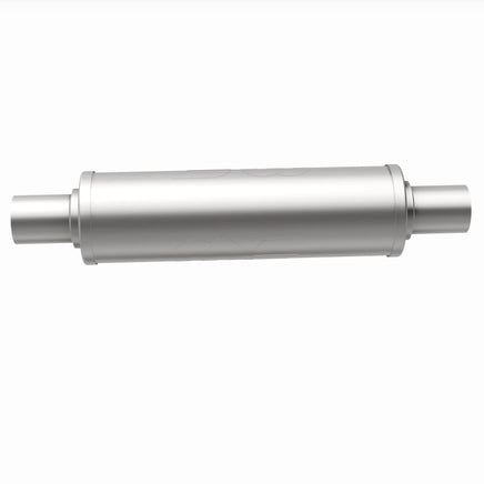 The MagnaFlow 4in. Round Straight-Through Performance Exhaust Muffler 10414 brings our world-famous exhaust sound and dyno-proven performance to your ride in a weight-optimized 4x4x14in. package with a premium satin finish. The straight-through free-flowing design of this round-bodied muffler's reversible, universal 2/2in. diameter inlet/outlet layout enables versatile installation options to match the spacing requirements of your vehicle. Due to the cutting and welding involved, professional installation is highly recommended. Internally, 10414 utilizes a perforated stainless steel core wrapped in stainless steel mesh and acoustic fiber fill to achieve a powerful, resonant tone. This muffler is made of durable, corrosion resistant stainless steel and produced using cutting-edge CNC precision robotic manufacturing techniques, all backed by MagnaFlow's limited lifetime construction warranty.