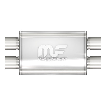 The MagnaFlow 4 X 9in. Oval Straight-Through Performance Exhaust Muffler 11385 is engineered to enhance your ride with a healthy helping of our signature exhaust sound and dyno-proven performance thanks to its free-flowing straight-through perforated stainless steel core wrapped in stainless steel mesh and acoustic fiber fill. The reversible, universal 2.25/2.25in. diameter inlet/outlet Straight-Through layout allows you to install it in whatever orientation and configuration you see fit. However, professional installation is highly recommended. Muffler 11385s weight-optimized 4x9x14in. oval-shaped body features a satin finish that elevates the overall aesthetics of your current exhaust setup. 11385 is made of durable, corrosion resistant stainless steel and produced using cutting-edge CNC precision robotic manufacturing techniques, all backed by MagnaFlow's limited lifetime construction warranty.